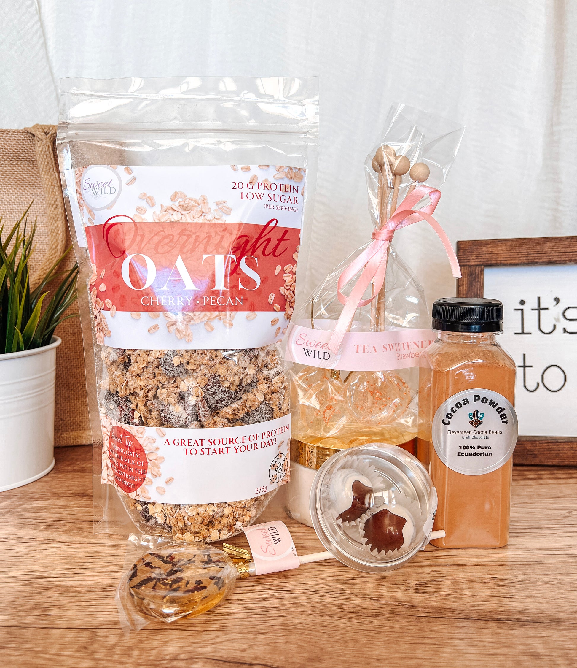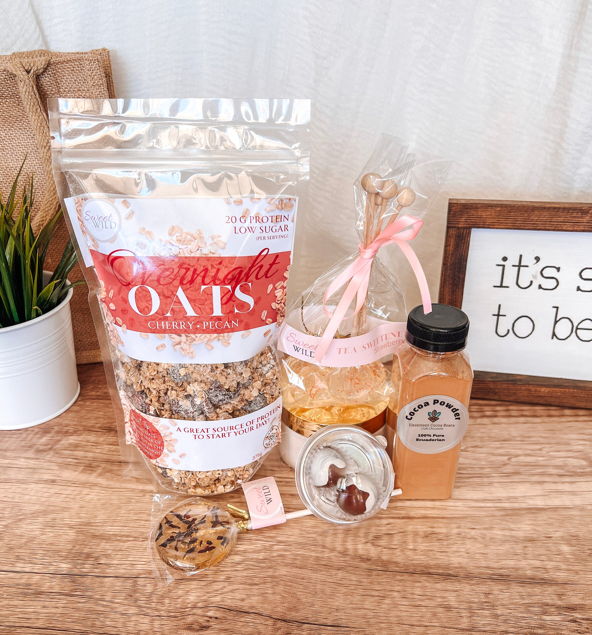 For slow mornings and sweet moments. This box features Sweet Wild’s large Overnight Oats, Tea Stirs, and a signature Lollipop, paired with Eleventeen Cocoa Bean Bon Bons and decadent Cocoa Powder. Beautifully wrapped in a decorative gift box that’s ready to enjoy or share.