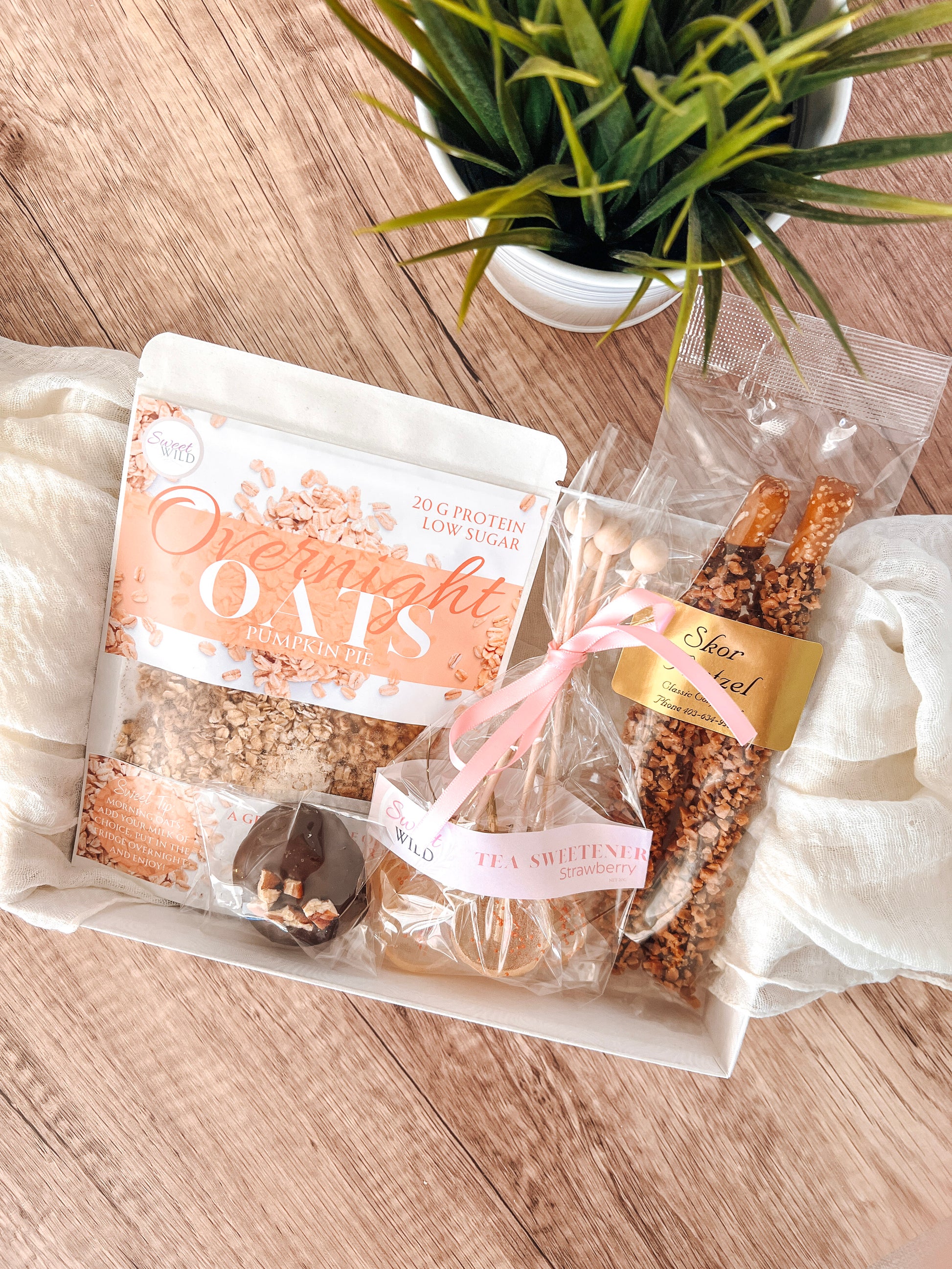 The perfect way to start (or end) your day. This bundle includes Sweet Wild Overnight Oats, Tea Stirs for your favorite cup, and two indulgent treats from Classic Confections — a soft cookie and a chocolate-covered pretzel duo.