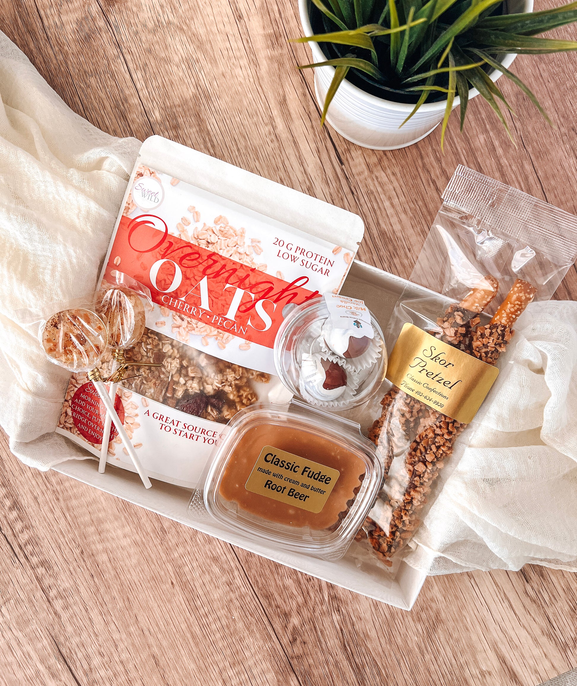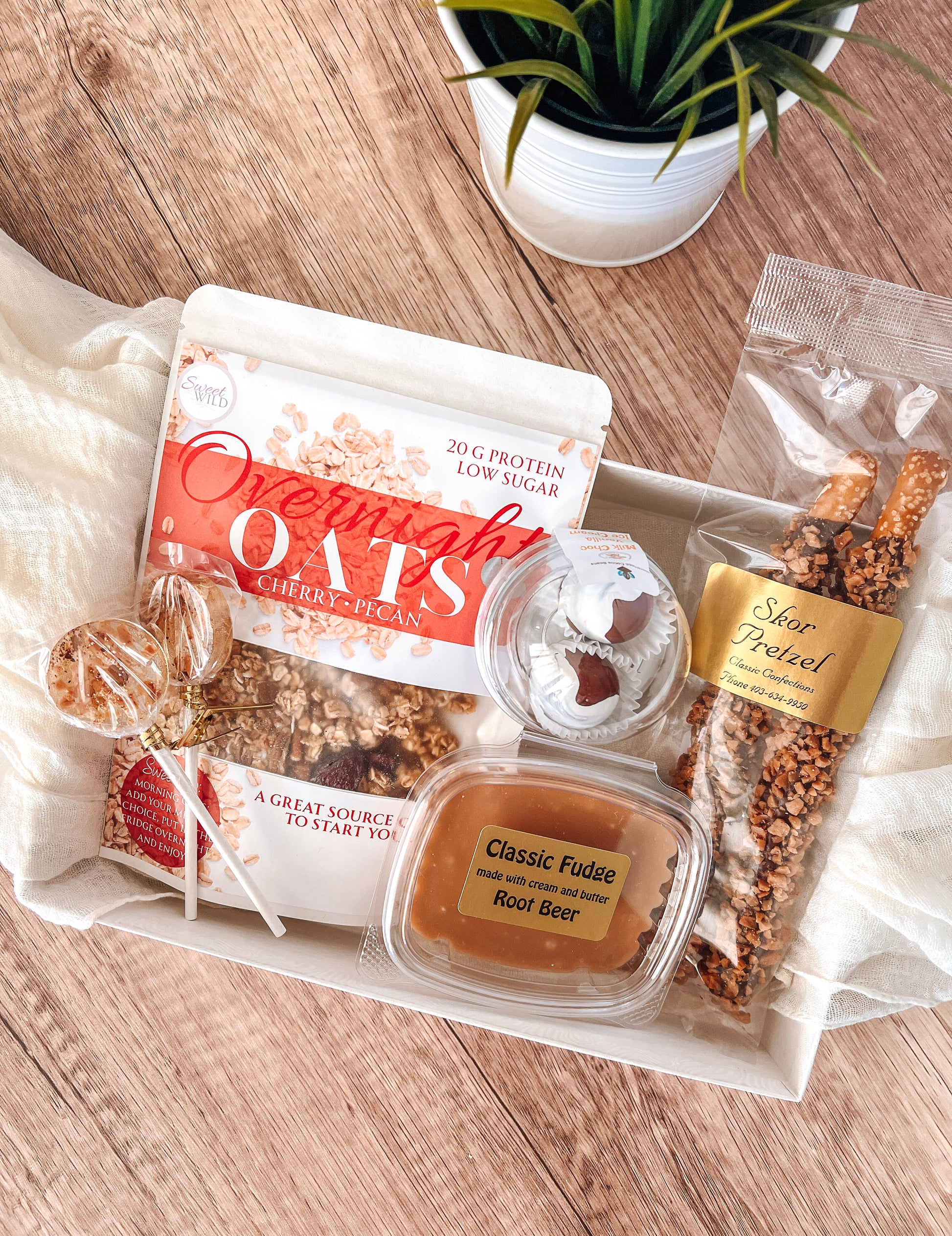 Sweet, simple, and made to delight. Includes Sweet Wild Overnight Oats, two Mini Lollipops, Classic Confections Double Pretzel and Fudge, and a pair of Eleventeen Cocoa Bean Bon Bons — all beautifully presented in a decorative gift box.